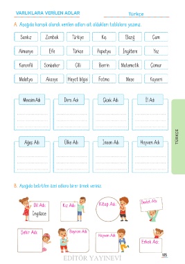 A� Aşağıda karışık olarak verilen adları ait oldukları tablolara yazınız.