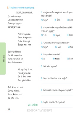 Çeşit çeşit hayvanlar. A) Koyun B) İnek C) Balık