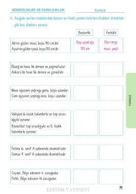 A� Aşağıda verilen cümlelerdeki benzer ve farklı yönleri belirten ifadeleri örnekteki