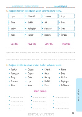 A� Aşağıdaki taşıtları ilgili oldukları ulaşım türlerinin altına yazınız.