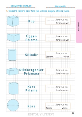 A� Geometrik cisimlerin kaçar tane yüzü ve köşesi olduğunu altlarına yazınız.