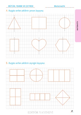 BÜTÜN, YARIM VE ÇEYREK Matematik A� Aşağıda verilen şekillerin yarısını boyayınız. MATEMATİK B. Aşağıda verilen şekillerin çeyreğini boyayınız. EDİTÖR YAYINEVİ 69 69