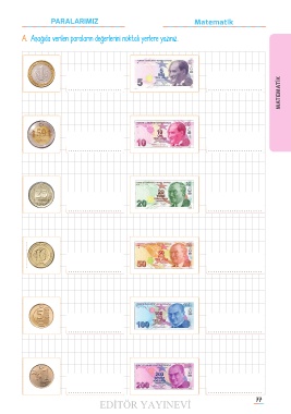 PARALARIMIZ Matematik A� Aşağıda verilen paraların değerlerini noktalı yerlere yazınız. MATEMATİK EDİTÖR YAYINEVİ 77 77