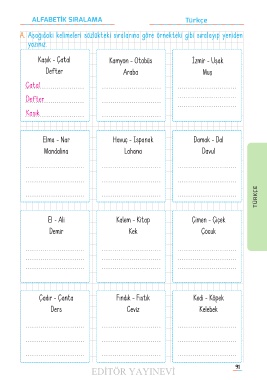 A� Aşağıdaki kelimeleri sözlükteki sıralarına göre örnekteki gibi sıralayıp yeniden