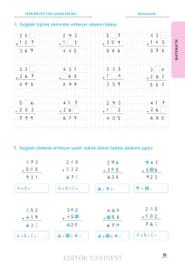 B. Aşağıdaki işlemlerde verilmeyen sayıları bularak istenen toplama işlemlerini yapınız.