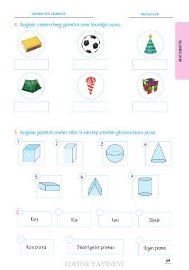 A� Aşağıdaki cisimlerin hangi geometrik cisme benzediğini yazınız.