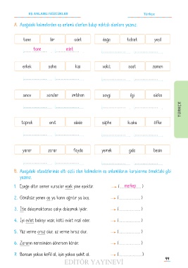 A� Aşağıdaki kelimelerden eş anlamlı olanları bulup noktalı alanlara yazınız.
