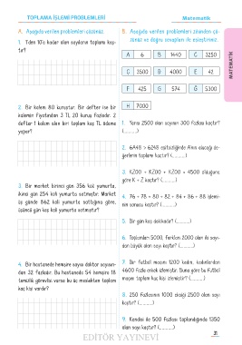 TOPLAMA İŞLEMİ PROBLEMLERİ Matematik