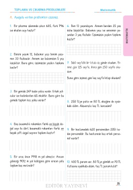 TOPLAMA VE ÇIKARMA PROBLEMLERİ Matematik