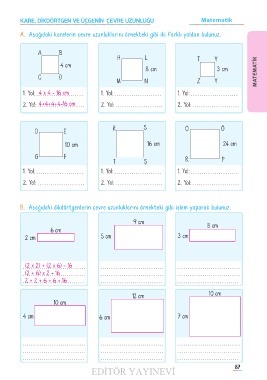 A� � Aşağıdaki karelerin çevre uzunluklarını örnekteki gibi iki farklı yoldan bulunuz.Aşağıdaki karelerin çevre uzunluklarını örnekteki gibi iki farklı yoldan bulunuz.