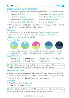 { Note: Günlerden önce “on”, saatlerden önce “at” ve günün bölümlerinden önce