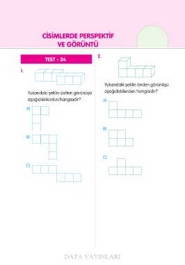 CİSİMLERDE PERSPEKTİF VE GÖRÜNTÜ 2. TEST - 24 1. Yukarıdaki şeklin önden görünüşü Yukarıdaki şeklin üstten görünüşü aşağıdakilerden hangisidir? aşağıdakilerden hangisidir? A) A) B) B) C) C) DATA YAYINLARI