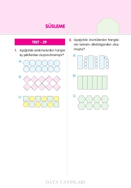 SÜSLEME 2. Aşağıdaki örüntülerden hangisi- TEST - 29 nin tamamı dikdörtgenden oluş- 1. Aşağıdaki süslemelerden hangisi muştur? eş şekillerden oluşturulmamıştır? A) A) B) B) C) C) DATA YAYINLARI