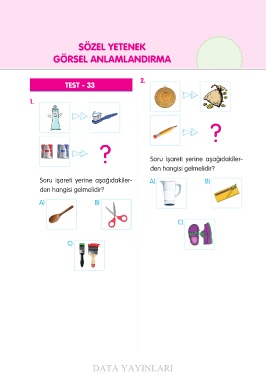 SÖZEL YETENEK GÖRSEL ANLAMLANDIRMA 2. TEST - 33 1. Soru işareti yerine aşağıdakiler- den hangisi gelmelidir? Soru işareti yerine aşağıdakiler- A) B) den hangisi gelmelidir? A) B) C) C) DATA YAYINLARI