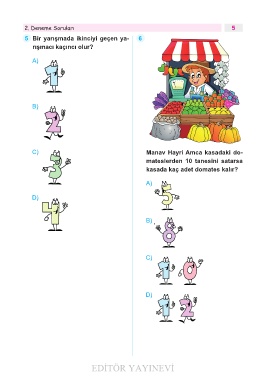 2. Deneme Soruları 5 5 Bir yarışmada ikinciyi geçen ya- 6 rışmacı kaçıncı olur? A) B) C) Manav Hayri Amca kasadaki do- mateslerden 10 tanesini satarsa kasada kaç adet domates kalır? A) D) B) C) D) EDİTÖR YAYINEVİ