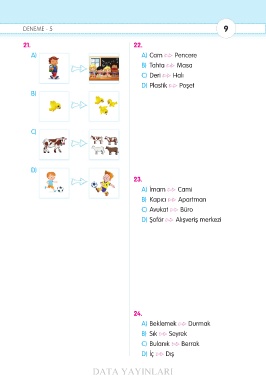 DENEME - 5 9 21. 22. A) A) Cam Pencere B) Tahta Masa C) Deri Halı D) Plastik Poşet B) C) D) 23. A) İmam Cami B) Kapıcı Apartman C) Avukat Büro D) Şoför Alışveriş merkezi 24. A) Beklemek Durmak B) Sık Seyrek C) Bulanık Berrak D) İç Dış DATA YAYINLARI