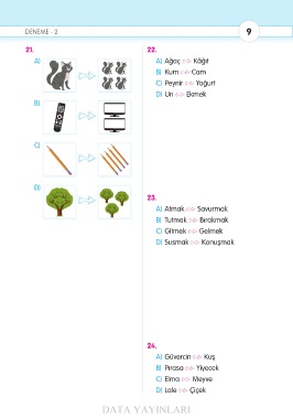 DENEME - 2 9 21. 22. A) A) Ağaç Kâğıt B) Kum Cam C) Peynir Yoğurt D) Un Ekmek B) C) D) 23. A) Atmak Savurmak B) Tutmak Bırakmak C) Gitmek Gelmek D) Susmak Konuşmak 24. A) Güvercin Kuş B) Pırasa Yiyecek C) Elma Meyve D) Lale Çiçek DATA YAYINLARI