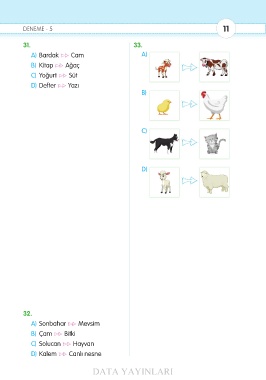 DENEME - 5 11 31. 33. A) Bardak Cam A) B) Kitap Ağaç C) Yoğurt Süt D) Defter Yazı B) C) D) 32. A) Sonbahar Mevsim B) Çam Bitki C) Solucan Hayvan D) Kalem Canlı nesne DATA YAYINLARI