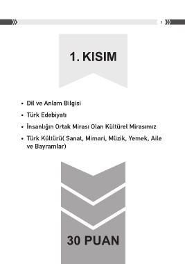 5 1. KISIM • Dil ve Anlam Bilgisi • Türk Edebiyatı • İnsanlığın Ortak Mirası Olan Kültürel Mirasımız • Türk Kültürü( Sanat, Mimari, Müzik, Yemek, Aile ve Bayramlar) 30 PUAN
