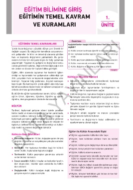 Bu bölümde eğitim kavramlarının tanımı, kültür, eğitim, ● Kültürel değerler, toplumsal bağların güçlenmesine