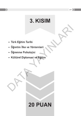 271 3. KISIM DATA YAYINLARI • Türk Eğitim Tarihi • Öğretim İlke ve Yöntemleri • Öğrenme Psikolojisi • Kültürel Diplomasi ve Eğitim 20 PUAN