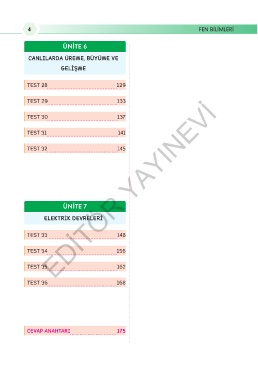 4 FEN BİLİMLERİ ÜNİTE 6 CANLILARDA ÜREME, BÜYÜME VE GELİŞME TEST 28 129 EDİTÖR YAYINEVİ TEST 29 133 TEST 30 137 TEST 31 141 TEST 32 145 ÜNİTE 7 ELEKTRİK DEVRELERİ TEST 33 148 TEST 34 156 TEST 35 162 TEST 36 168 CEVAP ANAHTARI 175