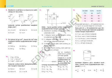 9. Öz kütlesi 50 g/ cm , hacmi 60 cm³ olan C) 2. bölgede kütle sabit, hacim artmış, ci- C) K ve M aynı, L farklı türdendir.