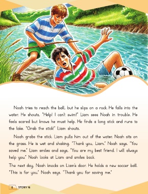 water. He shouts, “Help! I can’t swim!” Liam sees Noah in trouble. He