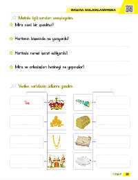 OKUMA ANLAMLANDIRMA Metinle ilgili soruları cevaplayalım. Mira nasıl bir çocuktur? Haritanın köşesinde ne yazıyordu? Haritada neresi işaret ediliyordu? Mira ve arkadaşları hazineyi ne yapmışlar? Verilen varlıkların adlarını yazalım. Taç 1. Sınıf 35