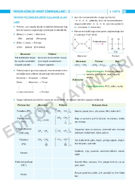 • Yaygın kullanılan polimerleri oluşturan monomerler ve kullanım alanları aşağıda verilmiştir.