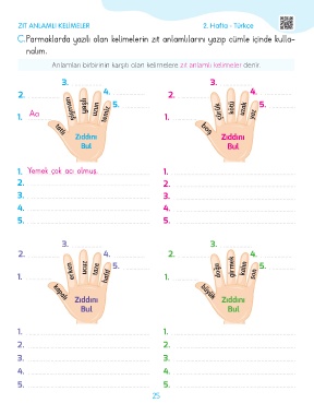 C. Parmaklarda yazılı olan kelimelerin zıt anlamlılarını yazıp cümle içinde kulla-