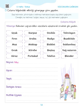 Yönerge: Kelimeleri çağrıştırdıkları sözcüklerle eşleştirerek örnekteki gibi yazalım.