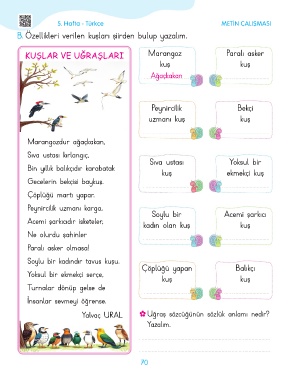 B. Özellikleri verilen kuşları şiirden bulup yazalım.