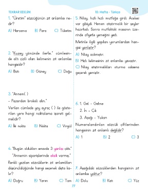 1. “Üretim” sözcüğünün zıt anlamlısı ne- 5. Nilay, hızlı hızlı mutfağa girdi. Acelesi