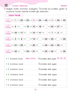 1. örüntünün kuralı beşer artmış. Örüntüdeki eksik sayılar 15, 30, 45