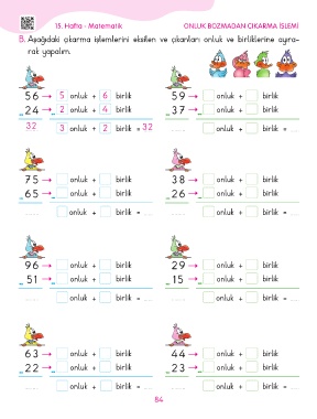 B. Aşağıdaki çıkarma işlemlerini eksilen ve çıkanları onluk ve birliklerine ayıra-