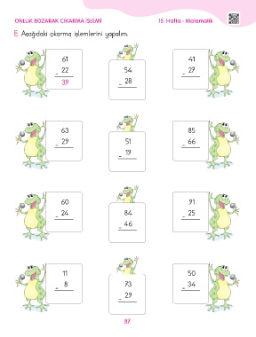 ONLUK BOZARAK ÇIKARMA İŞLEMİ 15. Hafta - Matematik E. Aşağıdaki çıkarma işlemlerini yapalım. 61 41 - 22 54 - 27 39 - 28 63 85 - 29 51 - 66 - 19 60 91 - 24 84 - 25 - 46 11 50 - 8 73 - 34 - 29 87