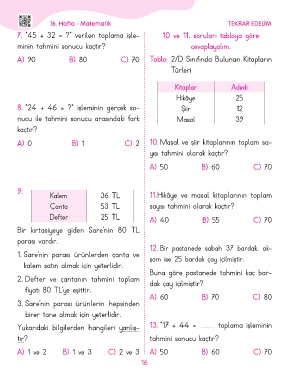 7. “45 + 32 = ?” verilen toplama işle- 10 ve 11. soruları tabloya göre