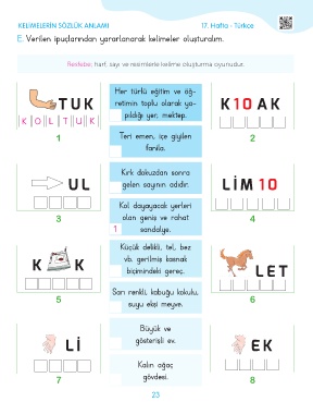 E. Verilen ipuçlarından yararlanarak kelimeler oluşturalım.