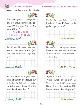 18. Hafta - Matematik TOPLAMA VE ÇIKARMA İŞLEMİ PROBLEMLERİ