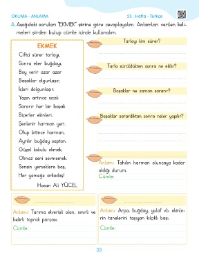 A. Aşağıdaki soruları ‘‘EKMEK’’ şiirine göre cevaplayalım. Anlamları verilen keli-