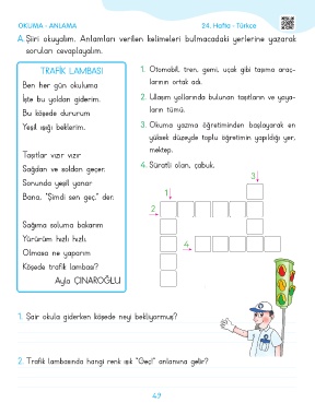 A. Şiiri okuyalım. Anlamları verilen kelimeleri bulmacadaki yerlerine yazarak