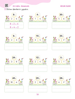 24. Hafta - Matematik BÖLME İŞLEMİ D. Bölme işlemlerini yapalım. 8 ÷ 4 ÷ 30 ÷ 2 4 1 4 5 6 8 ÷ 2 = 4 8 ÷ 4 = 2 6 ÷ 15 ÷ 35 ÷ 2 3 3 5 5 7 24 ÷ 12 ÷ 5 ÷ 3 8 2 4 5 1 40 ÷ 20 ÷ 28 ÷ 10 4 2 10 4 7 58