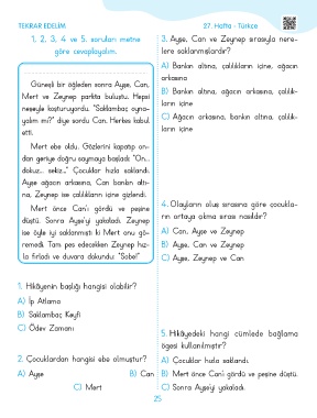 1, 2, 3, 4 ve 5. soruları metne 3. Ayşe, Can ve Zeynep sırasıyla nere-