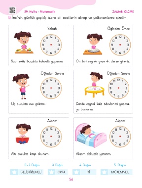 B. İnci’nin günlük yaptığı işlere ait saatlerin akrep ve yelkovanlarını çizelim.