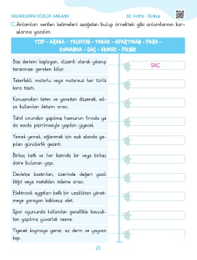 C. Anlamları verilen kelimeleri aşağıdan bulup örnekteki gibi anlamlarının kar-