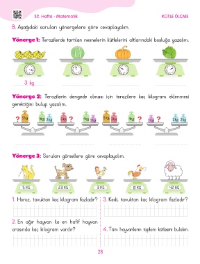 Yönerge 1: Terazilerde tartılan nesnelerin kütlelerini altlarındaki boşluğa yazalım.