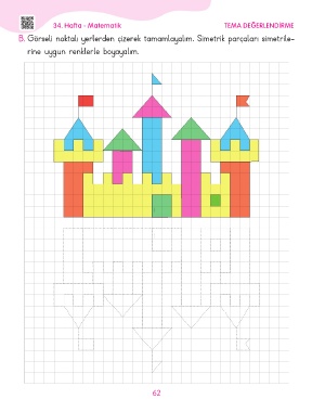 34. Hafta - Matematik TEMA DEĞERLENDİRME B. Görseli noktalı yerlerden çizerek tamamlayalım. Simetrik parçaları simetrile- rine uygun renklerle boyayalım. 62