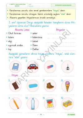 A 2. sınıf öğrencisi Derya aşağıdaki listeden hangilerini alırsa ihti-