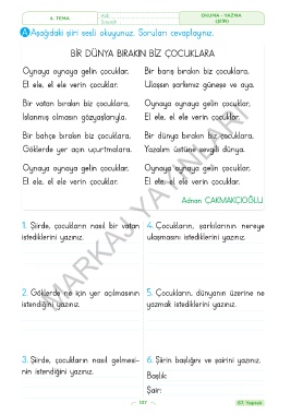 3. Şiirde, çocukların nasıl gelmesi- 6. Şiirin başlığını ve şairini yazınız.
